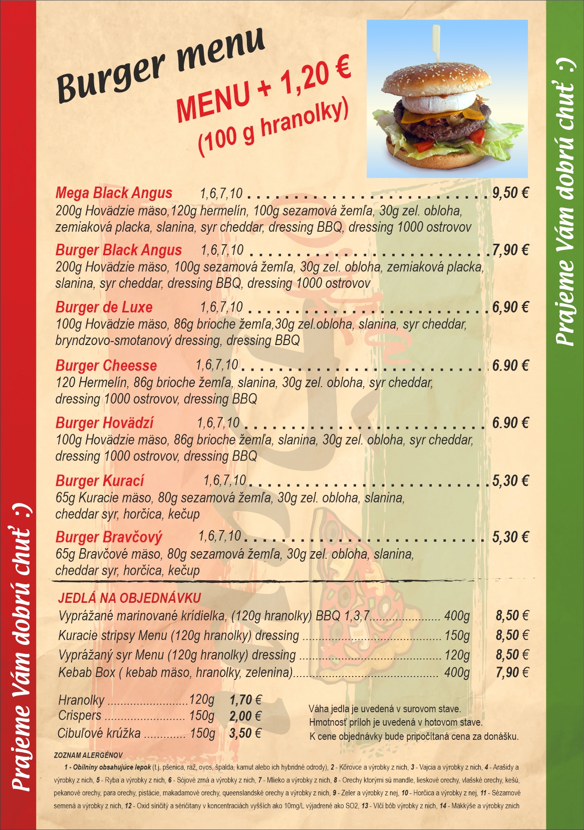 Naša burgrová ponuka je starostlivo zostavená – využívame kvalitné mäso, čerstvú zeleninu a domácu “omáčkovú dielňu”, vďaka ktorej sú naše burgre jedinečné.